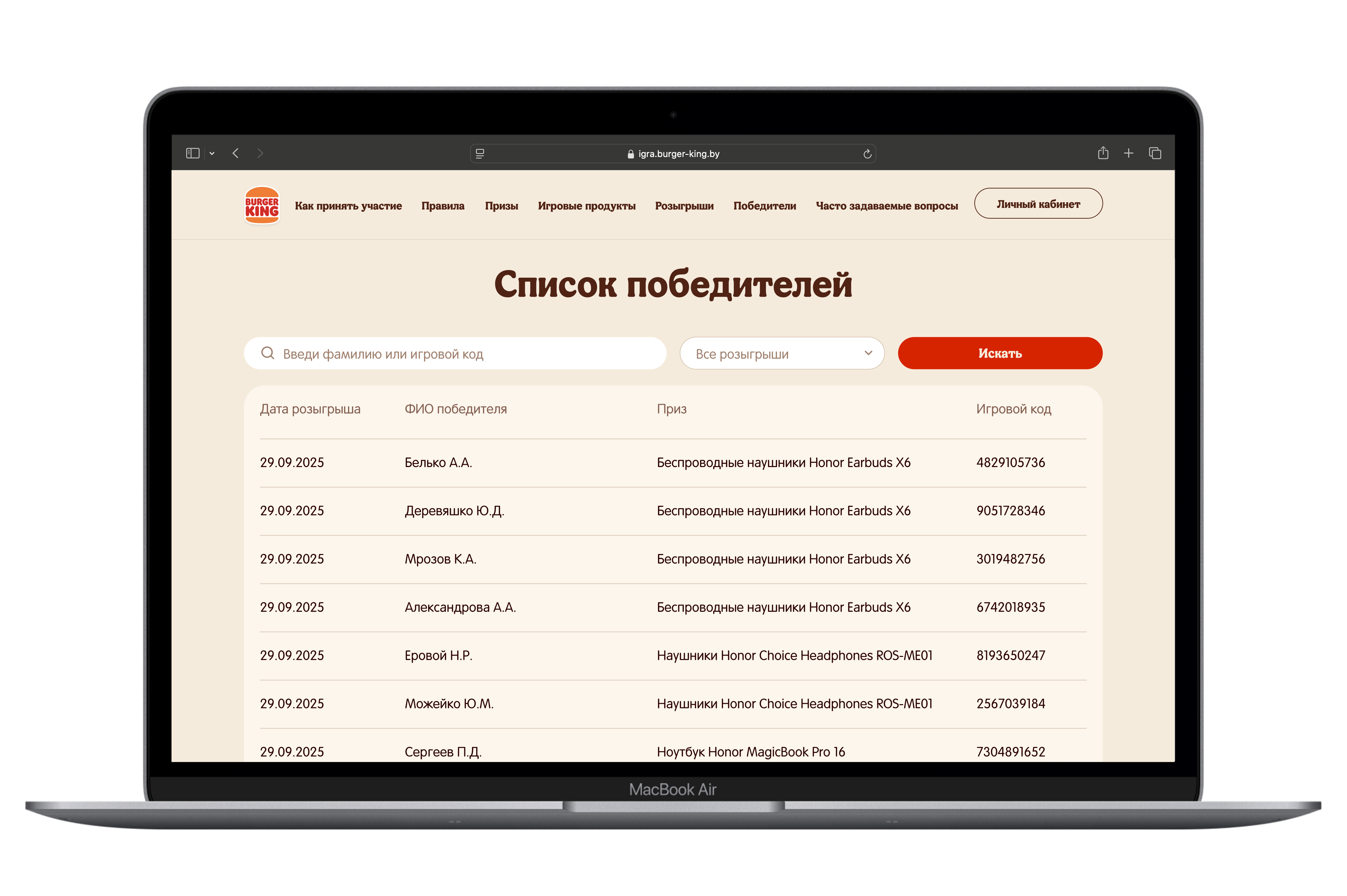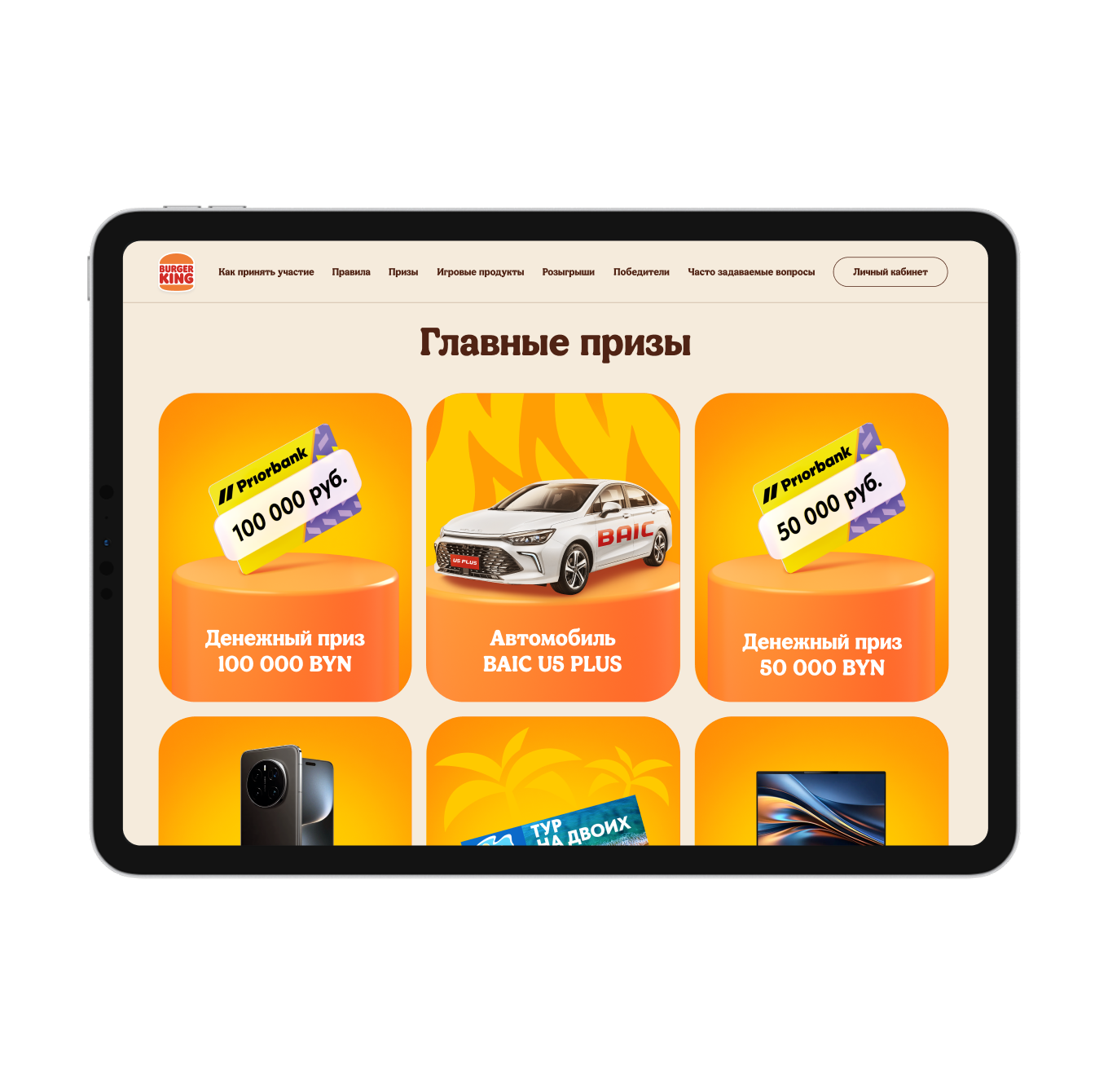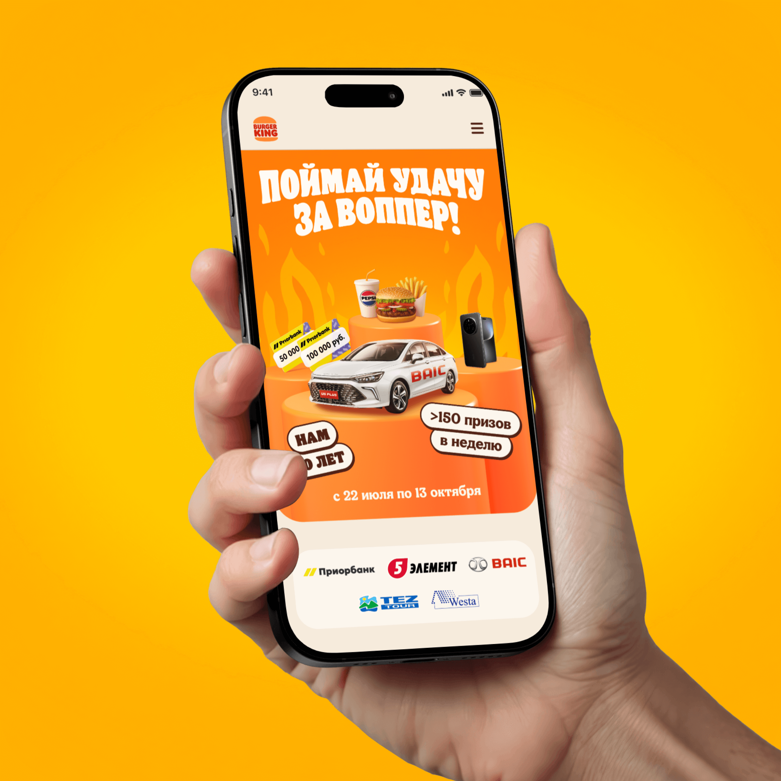The landing page successfully supported the nationwide promotional game for Burger King Belarus. A total of 26,300 people participated, showing strong engagement driven by clear structure, bold visuals, and simple navigation.